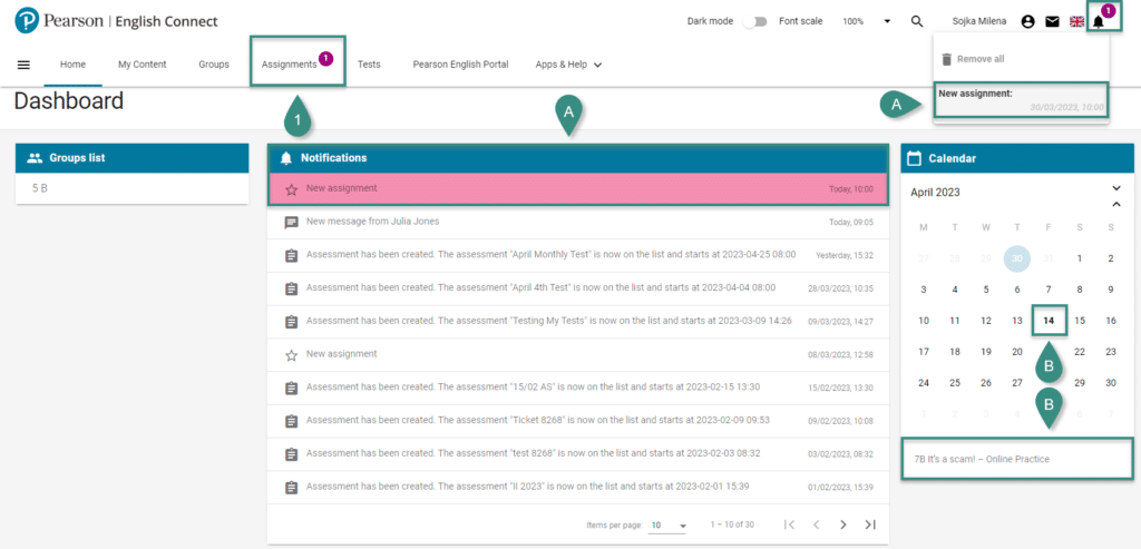 1. Przejdź do zakładki Zadania [Assignments] [1]. Opcjonalnie możesz uzyskać dostęp do zadań, klikając Powiadomienia [A] lub wybierając pogrubioną datę w Kalendarzu , która jest terminem wykonania zadania [B] .