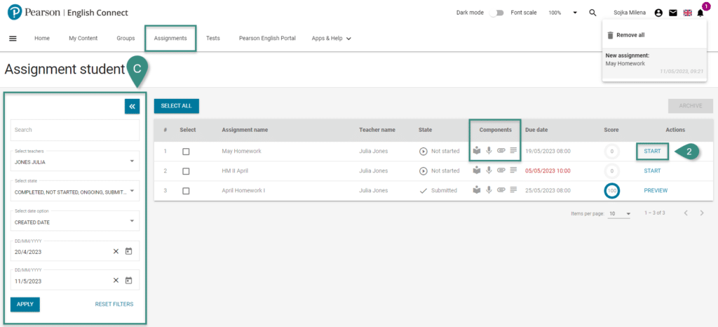 2. Wybierz zadanie, nad którym chcesz pracować i kliknij Start [2] . Możesz filtrować zadania według nauczyciela , statusu i dat [C], aby łatwiej znaleźć ćwiczenie, do którego potrzebujesz dostępu.