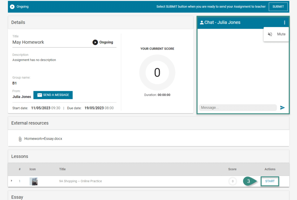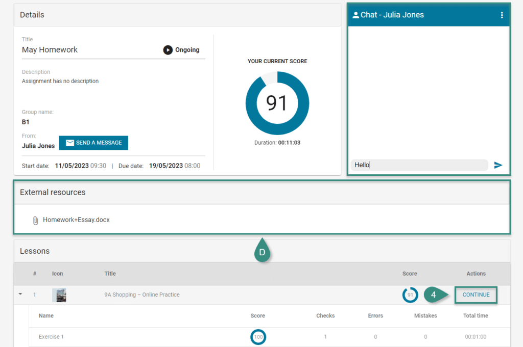 4. Jeśli nauczyciel nie oznaczył ćwiczenia jako jednorazowe, możesz kontynuować [4] lekcję po zapisaniu i wyjściu z niej. Możesz otworzyć Zasoby zewnętrzne , jeśli nauczyciel dołączył jakieś pliki lub adresy URL [D] .